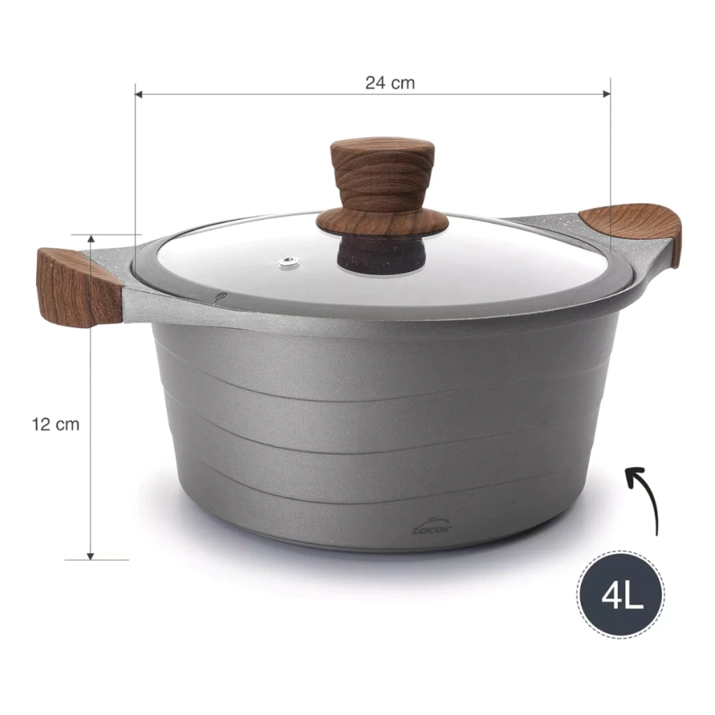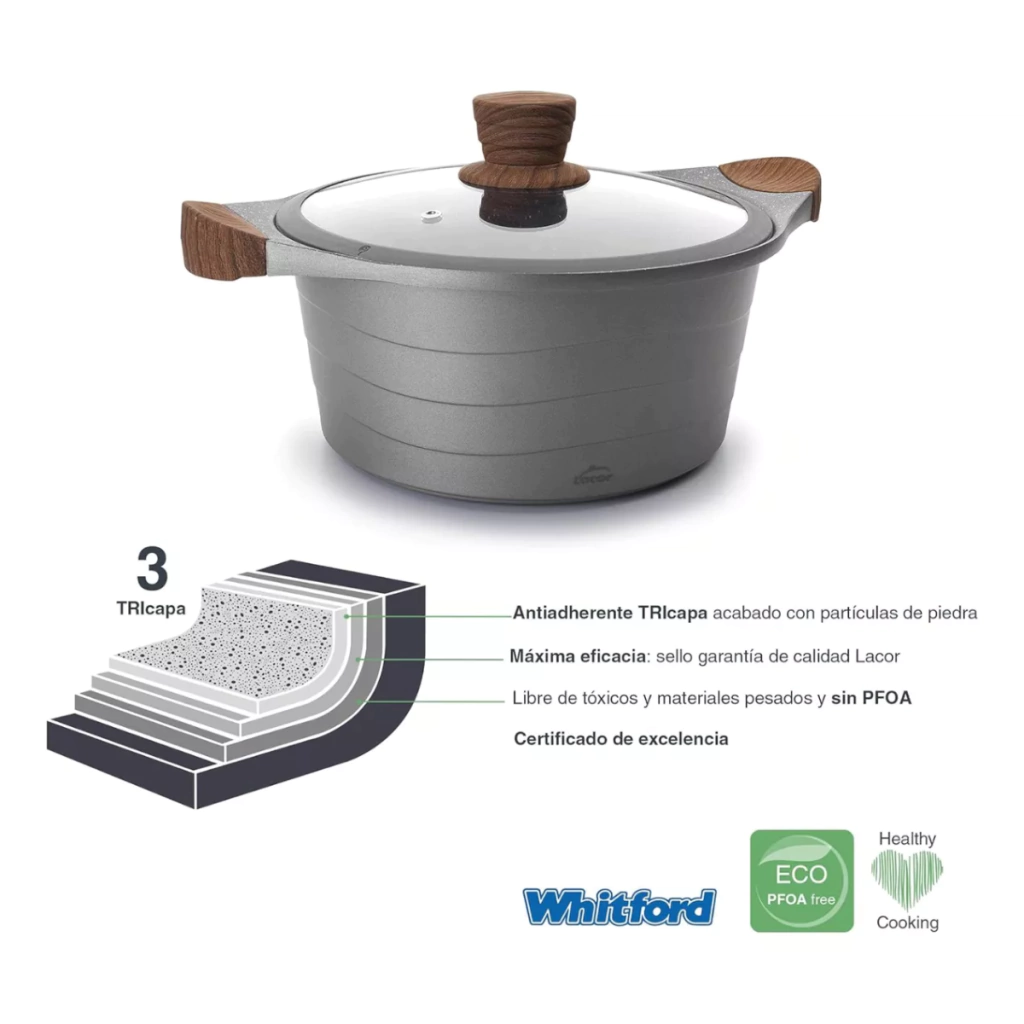 - La Cacerola alta con tapa de cristal de Lacor está fabricada en aluminio fundido de gran calidad y espesor. Su recubrimiento antiadherente acabado en partículas de piedra está libre de materiales tóxicos y pesados, es ecológico y libre de PFOA.
