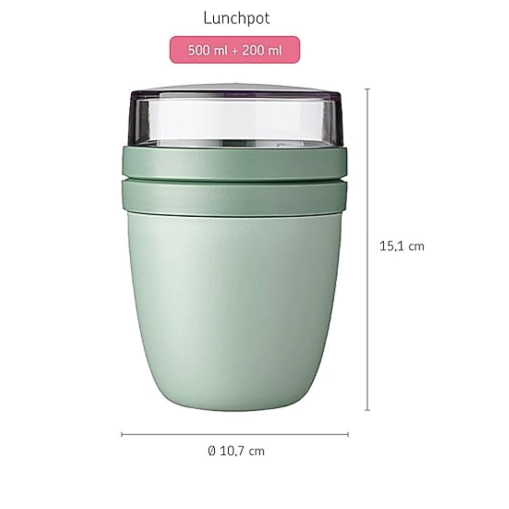 LUNCHPOT: La lonchera es ideal para yogur con frutos secos o sopa; La lonchera consta de 2 recipientes individuales, lo que permite mantener diferentes ingredientes separados.