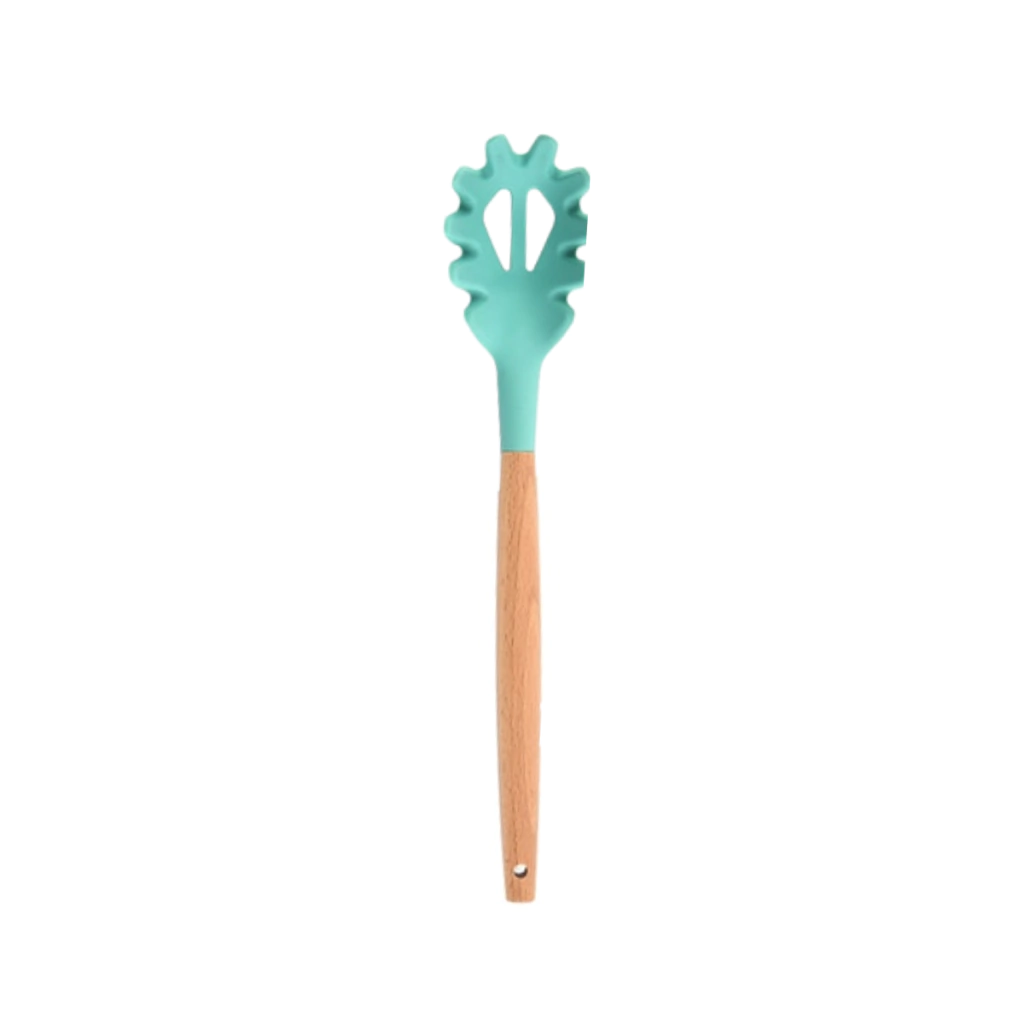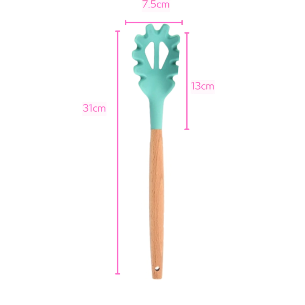 CUCHARA FIDEOS SILICONA LINEA AQUA Material: silicona de calidad alimentaria Rango de temperatura: -40 ? ~ 230 ? LARGO TOTAL: 31CM. LARGO DE LA CUCHARA: 13CM. LARGO DEL MANGO: 19CM. ANCHO DE LA CUCHARA: 7.5CM. MATERIAL: SILICONA Y MADERA. APTA LAVAVAJILLAS.;;;