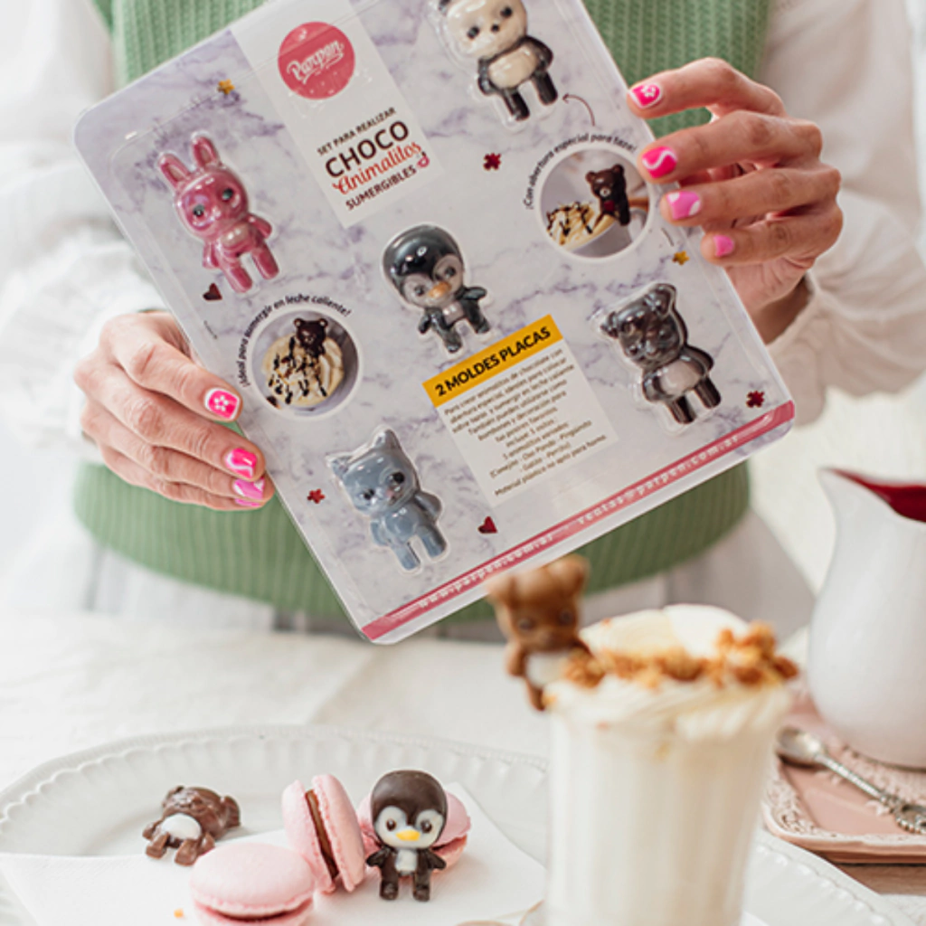 Set de 2 moldes placas, para crear animalitos de chocolate con abertura especial, ideales para colocar sobre tazas y sumergir en leche caliente. También pueden utilizarse como bombones y decoración para tus postres favoritos. Incluye: 5 ositos Kawaii ,5 animalitos (Conejito-Oso Panda-Pinguinito-Gatito-Perrito). Peso en chocolate: 25 gramos aprox.;;;