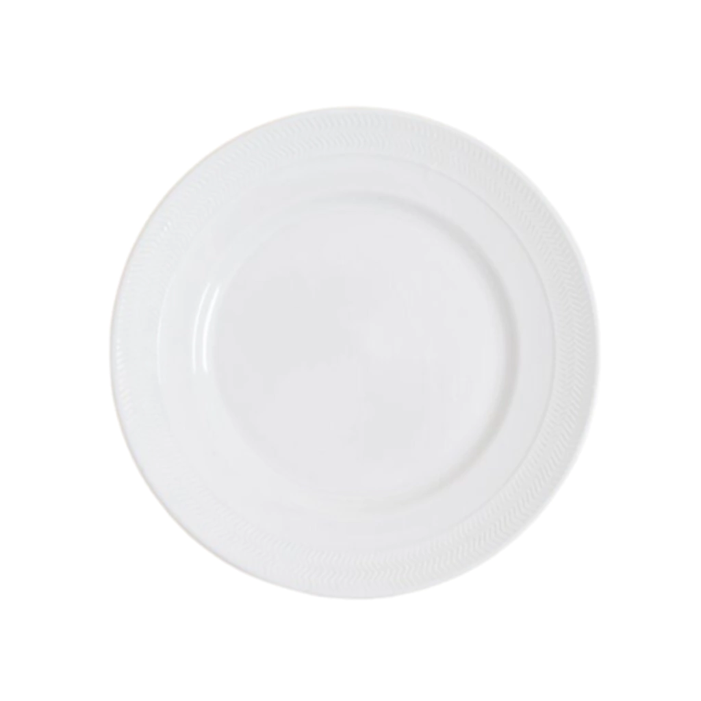 Plato playo fabricado en porcelana color blanco, con diseño sutil de relieve en sus bordes.