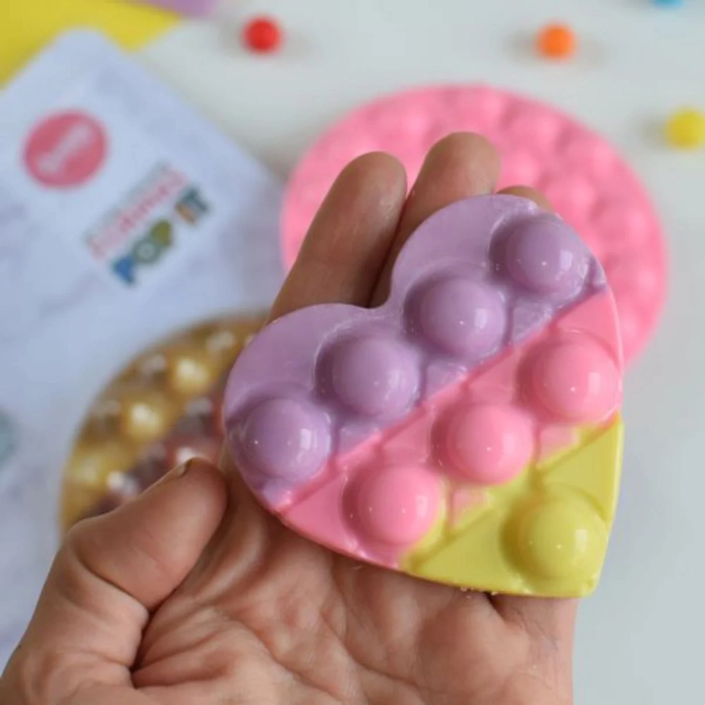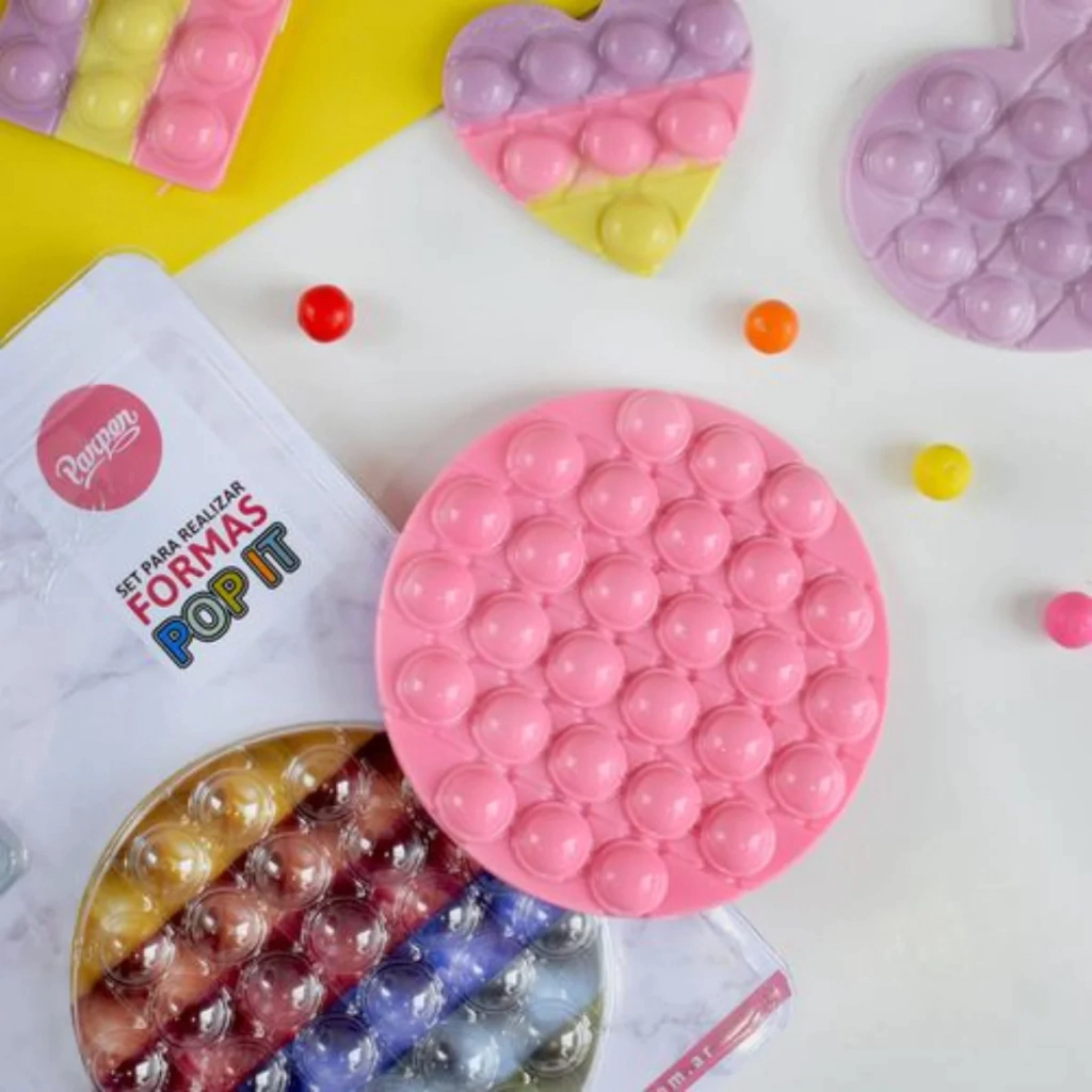 "Set de 2 moldes placas, especiales para realizar figuras tipo ""pop it"" en chocolate. En una de las placas se puede realizar 2 formas de corazón (uno de 7 x 7 cm y otro de 11 x 12,5 cm). Y con la otra placa se pueden hacer 1 cuadrado de 6 x 6 cm y una figura circular de 12 cm de diámetro. Ideales para aplicar sobre tortas, postres o para sumar a una mesa dulce.";;;