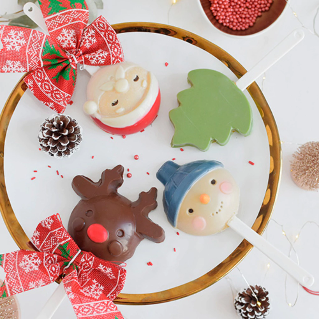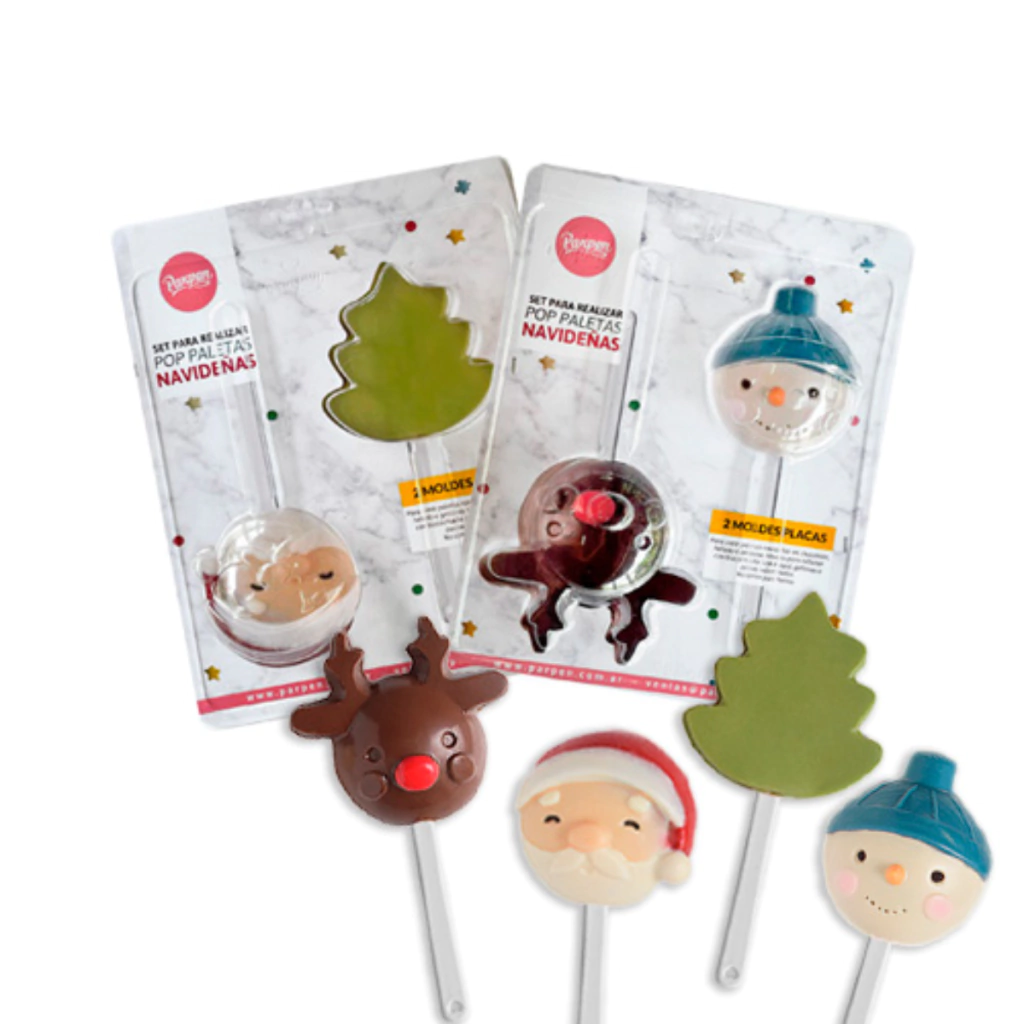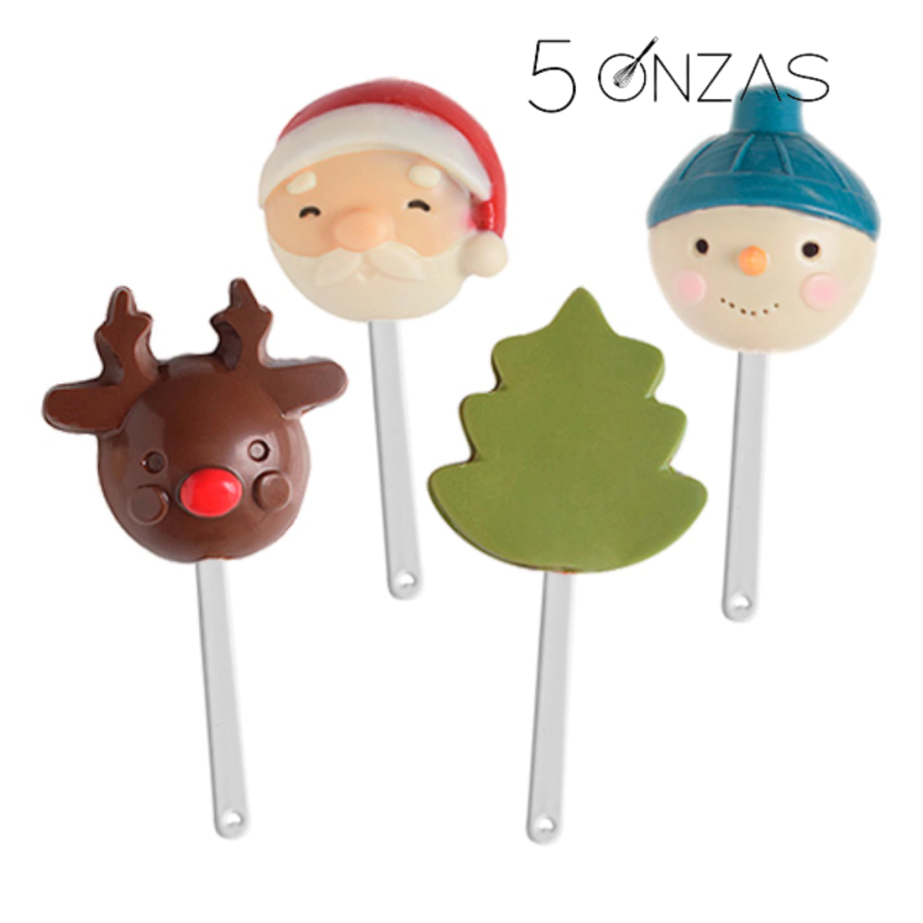 Para crear paletas navideñas en chocolate, helado o gelatina. Ideales para rellenar con bizcochuelo (cakepops), galletas o pastas saborizadas. Incluye: Pop paleta reno, Pop paleta Papa Noel, Pop paleta muñeco de nieve, Pop paleta árbol navideño;;;